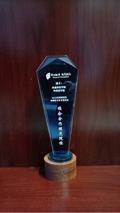 获得了该公司授予的“2022年度校企合作模范院校”水晶杯。