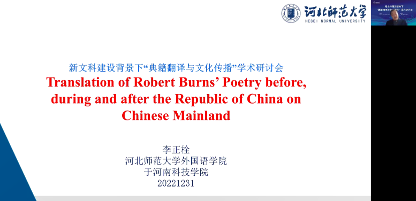 河北师范大学李正栓教授以“Translation of Robert Burn’s Poetry before, during and after the Republic of China on Chinese Mainland”为题,作主旨发言。