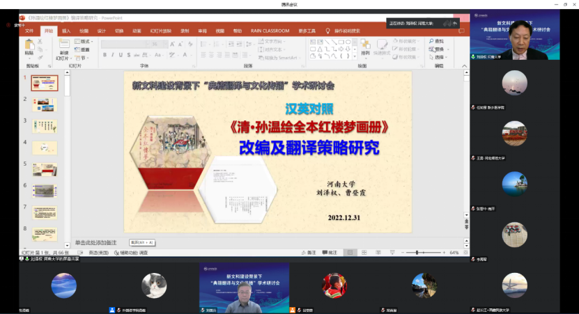 河南大学刘泽权教授以“汉英对照《清•孙温绘全本红楼梦画册》编、译策略研究”为题,作主旨发言。
