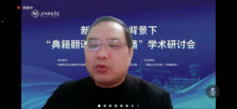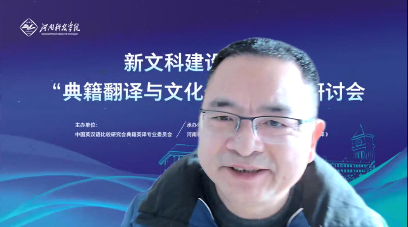 在典籍翻译研究领域取得的成绩。钱建成教授指出在新时代构建人类命运共同体的语境下,典籍翻译被赋予了新的内涵和使命,希望河南高校能立足灿烂的中原文化和浩瀚的典籍,加强翻译学科建设和翻译专业建设,培养中原文化翻译及传播人才。