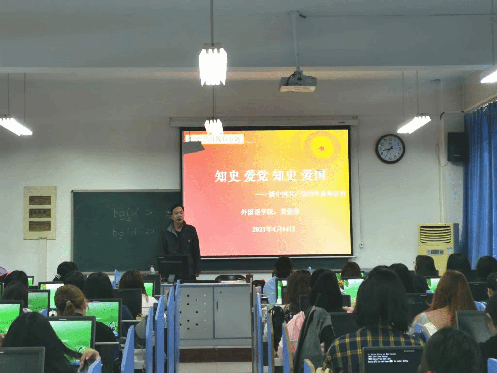 在7304教室开展第52期入党积极分子培训。龚俊朋以“知史爱党,知史爱国”为主题为全体入党积极分子上了一堂生动的党课。