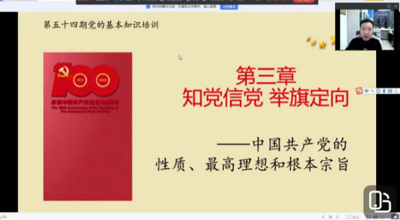 党委副书记龚俊朋通过钉钉直播的形式为第五十四期入党积极分子上党课,题目为:“知党信党 举旗定向”。