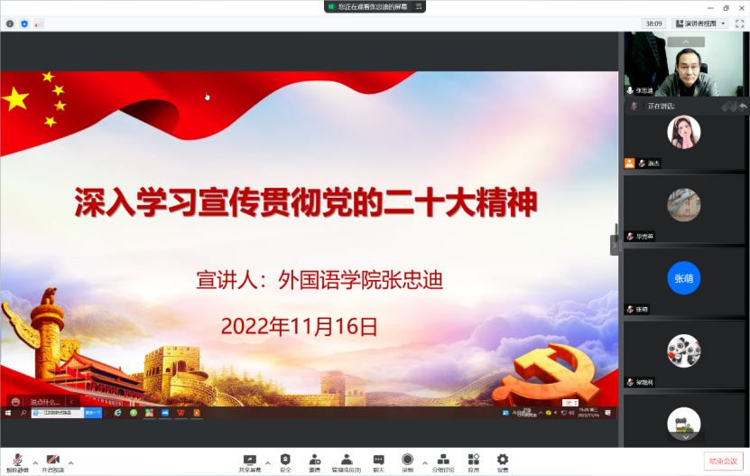 举行党委理论学习中心组(扩大)学习会,专题学习党的二十大精神。学院班子成员、党委委员、支部书记及科级以上干部参加了会议。会议通过腾讯会议形式进行,由学院党委书记张忠迪主持。
