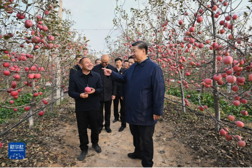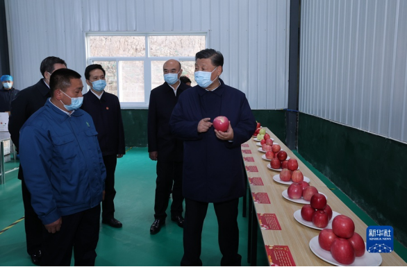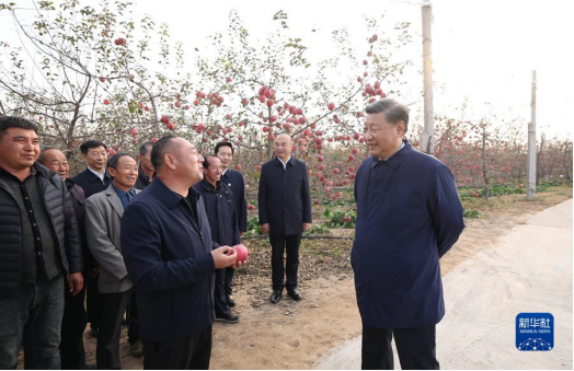 10月26日至28日,中共中央总书记、国家主席、中央军委主席习近平在陕西省延安市、河南省安阳市考察。这是26日下午,习近平在延安市安塞区高桥镇南沟村苹果洗选车间,察看当地种植的苹果。 新华社记者 鞠鹏 摄