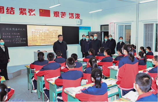 教学楼里,学生们正在上课。习近平走进高一(2)班教室,同师生亲切交流,问同学们有什么理想,长大后想做什么。一位同学说将来想当李时珍那样的医生,另一位同学说想考大学药剂专业,还有一位同学说想学外语、将来当一名外交翻译。习近平听了十分高兴,称赞他们人生目标明确,理想高尚。他勉励同学们从小树立远大理想,立志成为社会主义建设者和接班人,确保红色基因代代相传。