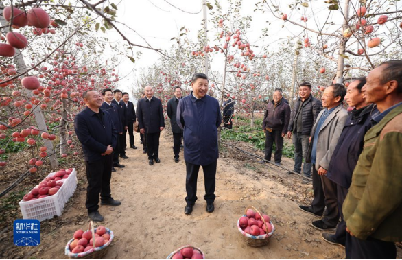 10月26日至28日,中共中央总书记、国家主席、中央军委主席习近平在陕西省延安市、河南省安阳市考察。这是26日下午,习近平在延安市安塞区高桥镇南沟村苹果园同老乡们亲切交流。 新华社记者 鞠鹏 摄