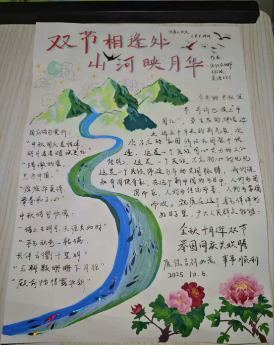 学院组织开展“双节相逢处,明月照家国”主题手抄报创作活动。同学们发挥创意,用画笔描绘中秋的明月、国庆的盛景,将对双节的美好想象和对家国的真挚情感融入手抄报中,每一幅作品都是对双节的独特诠释与深情告白。