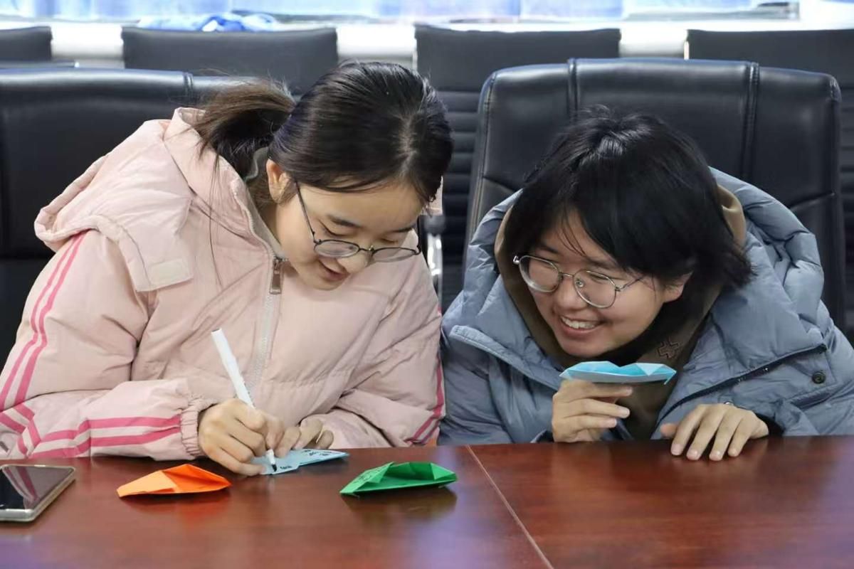 活动现场,彩纸在指尖翻飞,化成一颗颗真诚的心、一瓣瓣绽放的花。同学们提笔凝思,将受助的感激与对未来的期许郑重写下。一件件作品错落有致地铺展在桌上,五彩斑斓,方寸之间满载深情。这些寄语不仅是对关怀的回馈,更是“资助育人”成果的生动体现。
