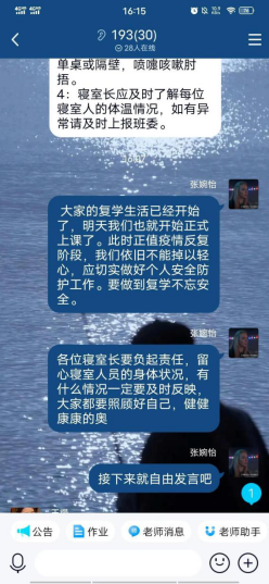 下午,学院组织返校学生以各班团支部为单位,利用钉钉、QQ等网络平台展开了线上主题班会团日活动。针对大家关心的问题,班会以“普及防疫知识,弘扬抗疫精神”、“疫情常态化防控,心理健康需呵护”、“防范网络诈骗,守护美好生活”等为主题,对基本防疫知识、学校疫情防控各项规定要求、心理健康防护以及防网络诈骗等方面进行了学习。