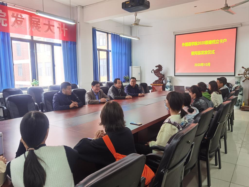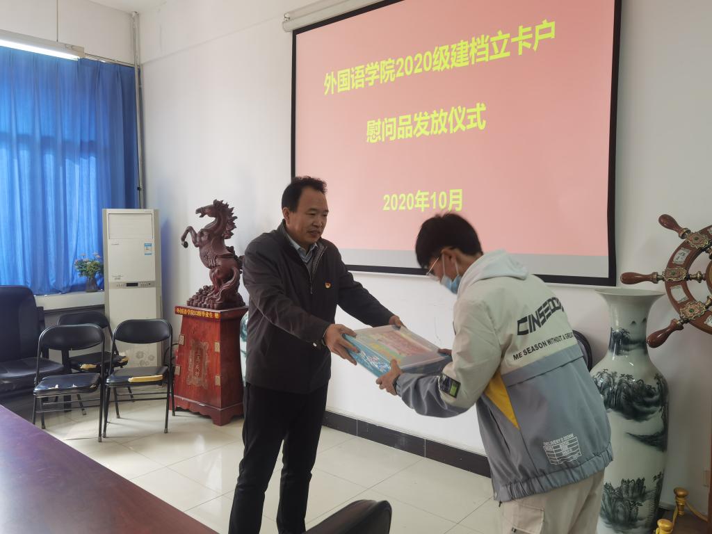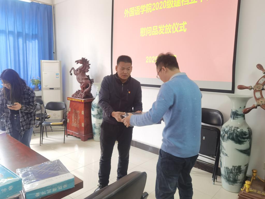 在7#211会议室举行了2020级贫困生慰问品发放仪式,院党委书记徐兆栋、副书记龚俊朋,副院长万文龙,团委书记张高峰、副书记时文鹏及全体受资助学生参加发放仪式。