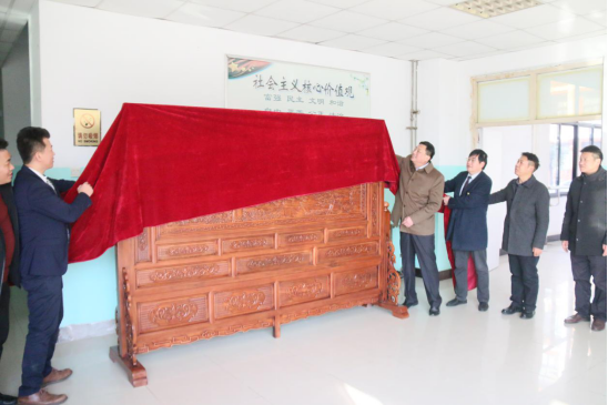 何松林代表学校为校友捐赠的香樟木木刻屏风进行揭牌,并祝福校友们前程似锦,常回家看看。