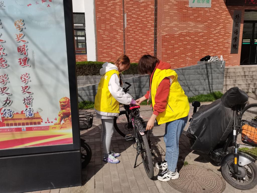 活动中,志愿者们身穿志愿服,分散在校园路旁,清扫路边垃圾,细心擦洗门窗、公告栏,摆放自行车等,用心志愿服务。