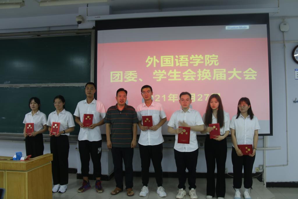 最后,学院党委副书记龚俊朋、团委书记张高峰、辅导员王淑杰、王欣欣分别为新一届团委、学生会干部颁发聘任证书,并拍照留影。
