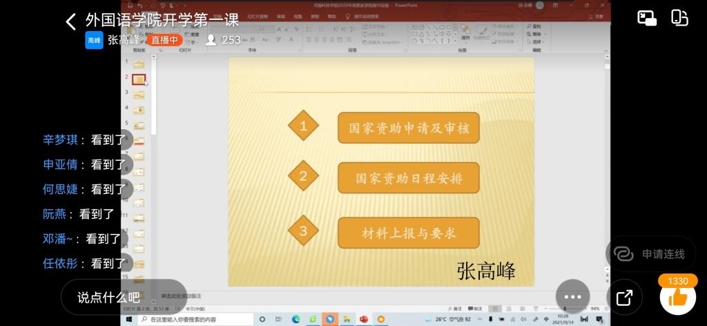 9月13日上午,团委书记张高锋以“资助育人 助我成长”为题,向2021级新生系统讲解了学校的资助政策及奖、助学金的评定标准,同时讲解了国家助学贷款的申请流程。他说,当前国家政策越来越好,希望家庭经济困难学生能够自立自强,在国家资助下顺利完成学业,绝不会让学生因贫困失学,同时告诫同学们远离不良校园贷。