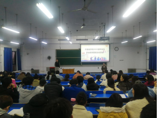 在3#4召开2022届毕业生安全教育暨就业动员会。学院党委副书记龚俊朋、团委书记张高峰、学院就业创业专管教师张超清、辅导员王欣欣及全体毕业生参加此次会议。