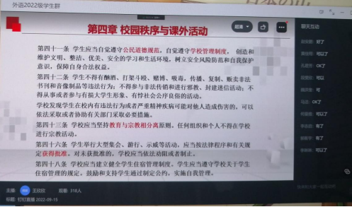 9月15日,辅导员王欣欣带领同学们认真学习了相关法律法规和学校管理规定。结合具体事例提醒同学们要遵纪守法、诚实守信,做一个文明守纪的新时代大学生。帮助同学们牢固树立“自我管理、自我服务、自我教育、自我监督”的意识,遵守学校规章制度,营造和谐、文明、有序的校园氛围。
