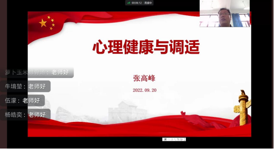 9月20日,团委书记张高峰以“心理健康与调试”为题,向2022级新生讲解心理健康教育相关内容,包括心理健康概述、大学生心理特点、心理调适方法等,通过案例分享及分析,帮助新生解答心理困惑,正确看待心理问题,培养平和理性的心态和良好的心理素质。
