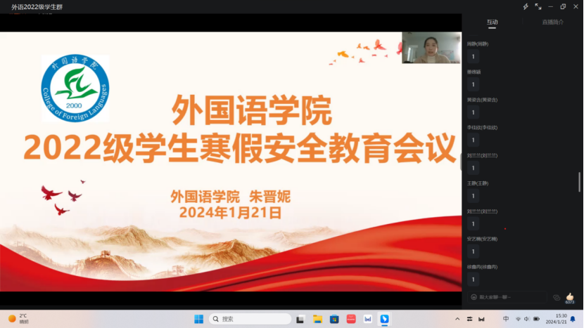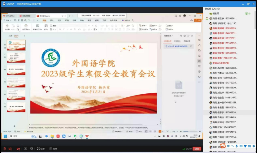 会上,各年级辅导员传达了学校的学生安全工作会议精神,结合现实生活中的具体案例分别从离校前的安全注意事项、回家途中的安全注意事项以及寒假期间的旅游安全、饮食安全、交通安全、网络安全、健康安全、心理安全、寒假打工安全等方面叮嘱学生提高安全防范意识,规范个人行为,注意自身安全。随后,各年级辅导员和学生家长就假期期间学生的安全工作进行了沟通交流,向家长说明了假期安全的重要性,希望家长能够进一步强化育人意识,关注学生心理健康,共筑家校合力共同体,助力学生全面发展。