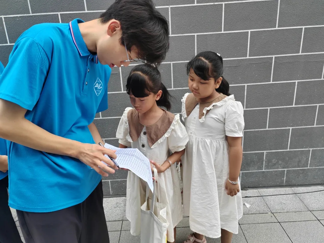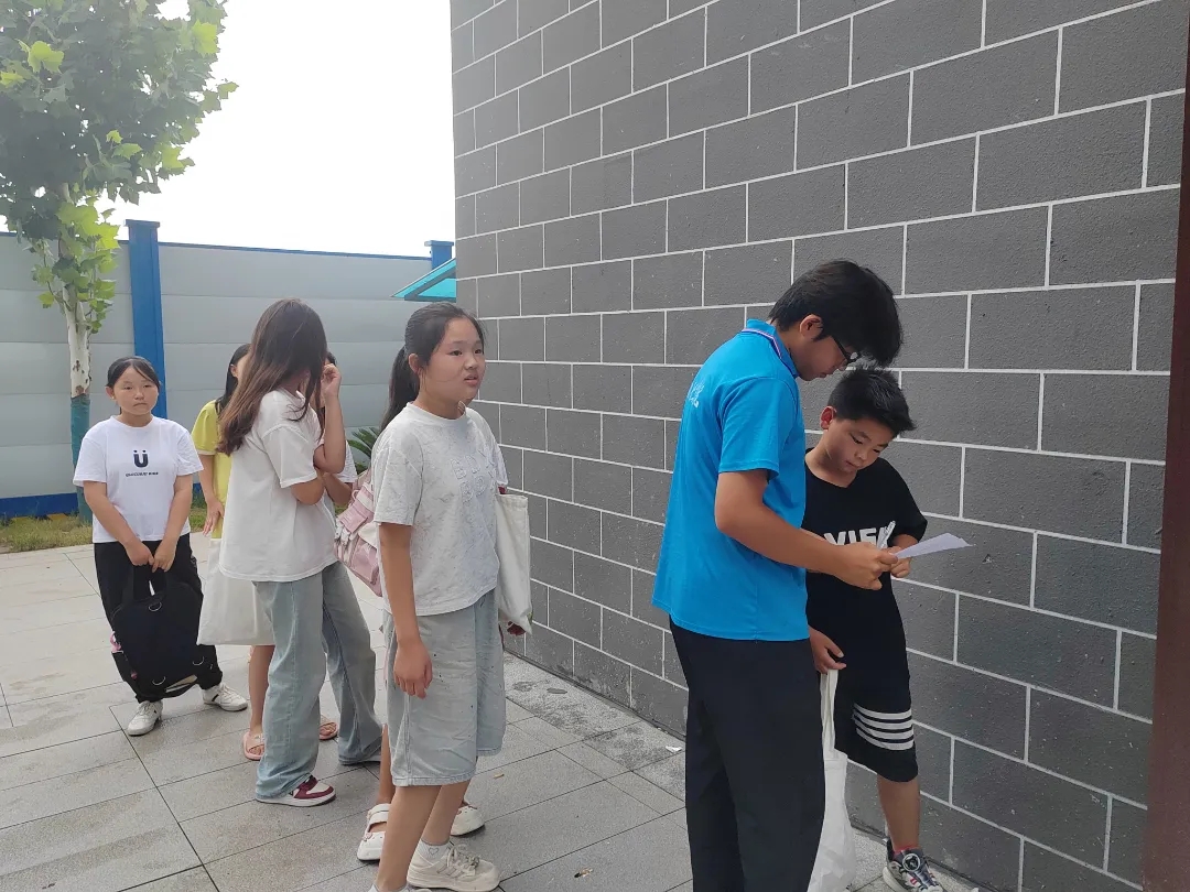 7月19日早晨,支教队成员在教室门口迎接学生,大家按照计划与分工,共同维持迎接学生的现场秩序。