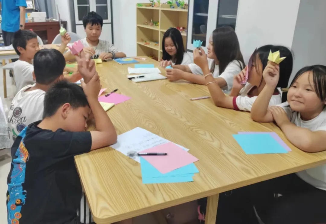 “折纸手工课上,支教队员将折纸材料分发给小朋友们,鼓励他们充分发挥自己的想象力与创造力。经过孩子们巧妙的折叠和组合,五彩斑斓的手工纸变成了一个个栩栩如生的折纸作品。”