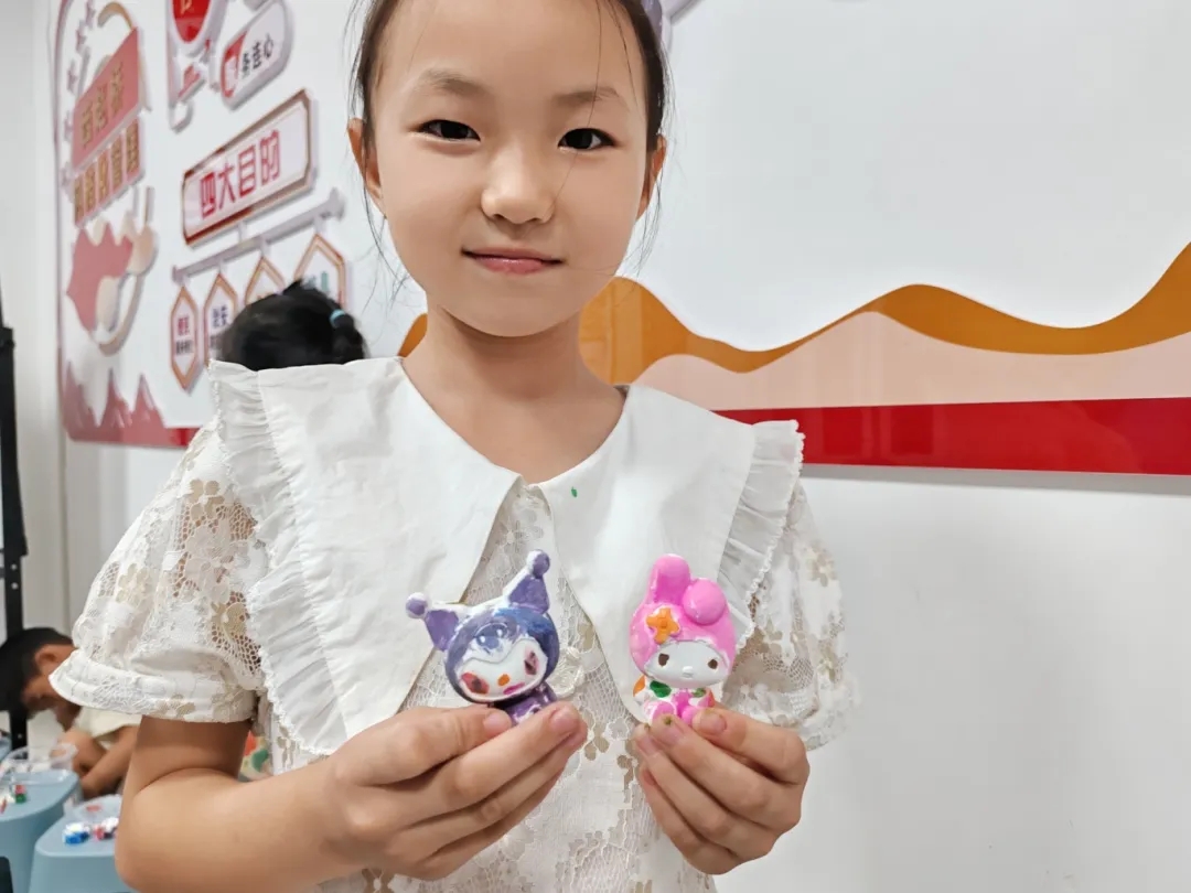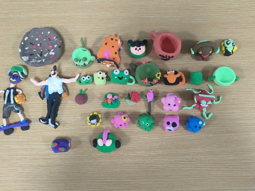 在手工课上,支教队员带领小朋友们进行了黏土手工和石膏娃娃绘画活动。老师们向孩子们展示了黏土制作和石膏娃娃涂色的方法,大家三人一组围成一圈,相互分享手中的材料。创作完成后,孩子们纷纷亮出自己的精心之作,分享自己的创作灵感和创作思路,和自己的作品合影留念。