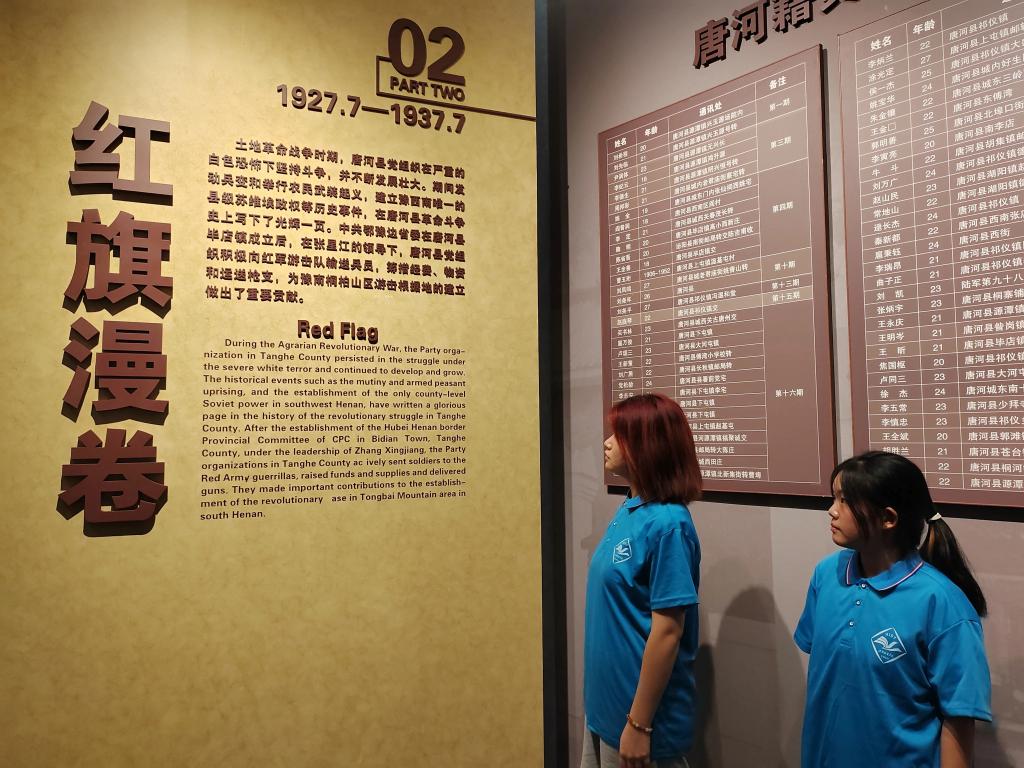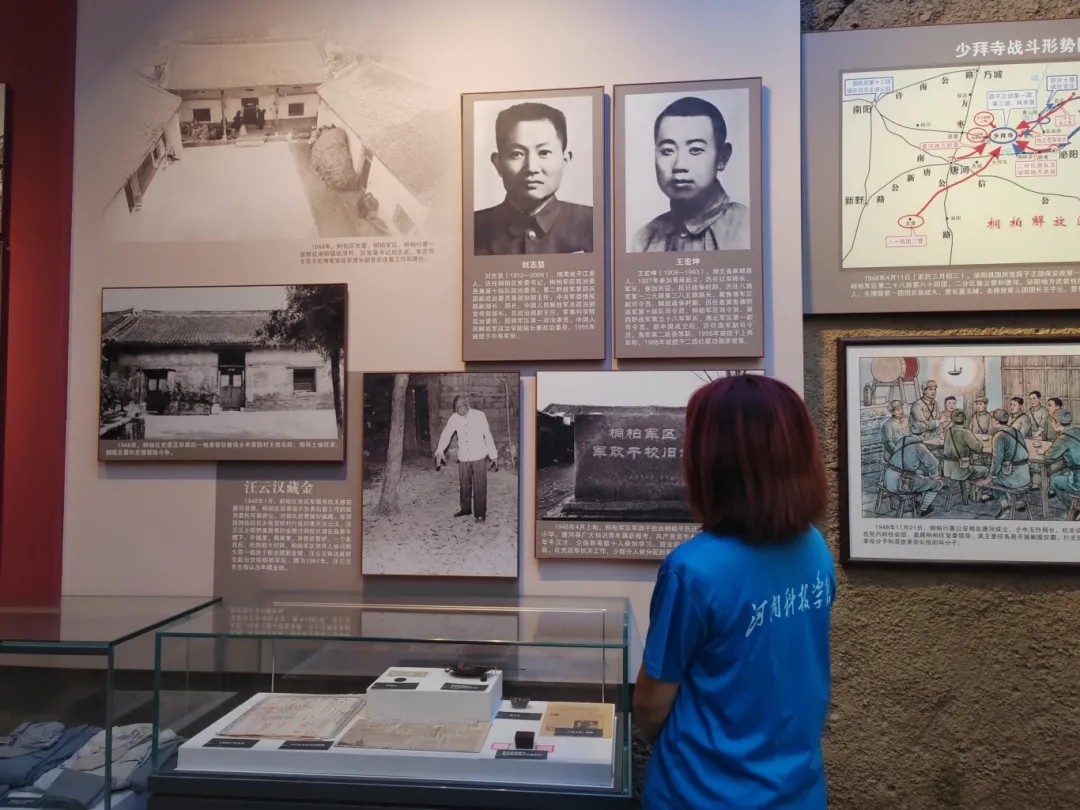 纪念馆分为革命历史展厅、将军厅、廉政建设厅和多媒体报告厅。按照唐河革命斗争史的脉络,陈展内容分为五四运动和大革命时期的“古唐星火”、土地革命战争时期的“红旗漫卷”、抗日战争时期的“众志成城”和解放战争时期的“千秋伟业”四大部分。在纪念馆内,团队成员们仔细参观了纪念馆内的各个展区,丰富的历史文物和充实的文史资料,使团队成员们对唐河革命斗争的历史和社会主义建设等有了更深入的了解。