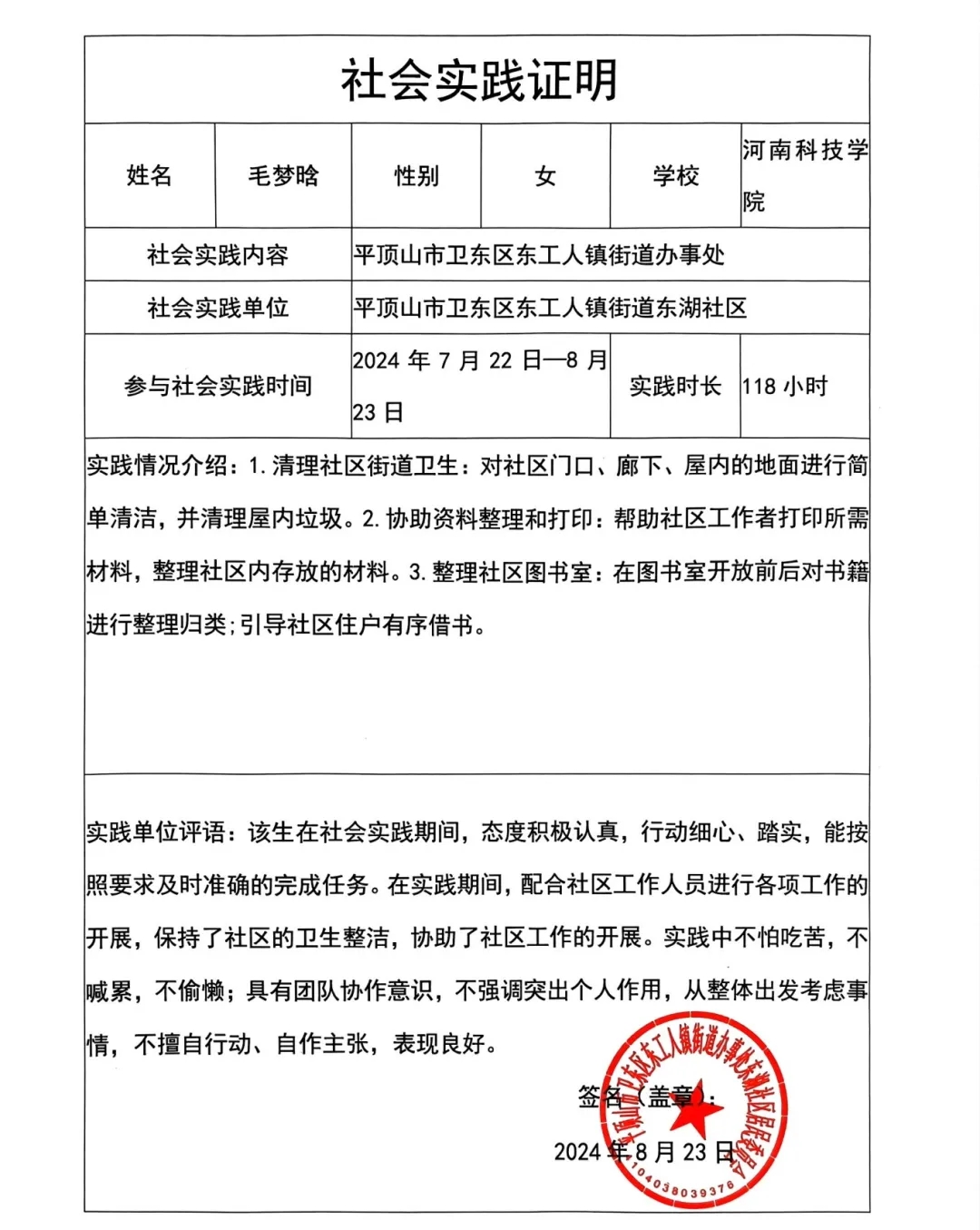 毛梦晗同学在暑假期间,积极投身于平顶山市卫东区东工人镇街道办事处的社会实践活动。在此期间她参加了多种志愿服务项目,如:清理社区街道卫生、协助社区工作者整理和打印所需材料、整理社区内存放的材料、在图书室开放前后对书籍进行整理归类、引导社区住户有序借书等。