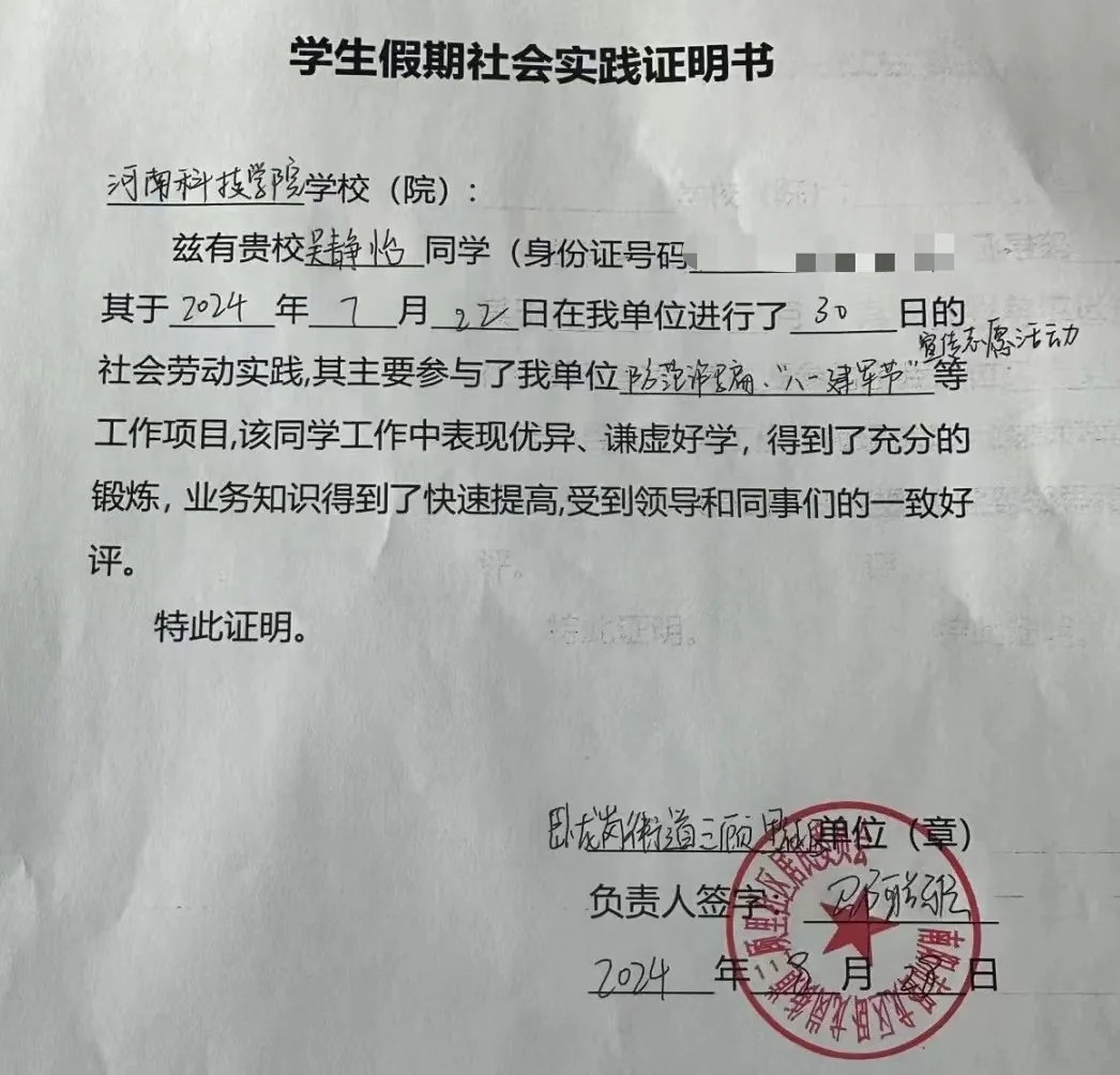 吴静怡在暑假期间参与了南阳市卧龙区三顾里社区组织的多项活动,如防范诈骗宣传志愿活动、“八一建军节”志愿服务活动、社区义诊服务活动、清洁家园社区志愿活动等。在防诈骗实践活动中,她热情地向居民们宣传讲解防诈骗知识,并耐心回答他们的问题。在“八一建军节”志愿服务活动中,她热心与退伍军人沟通,并协助社区工作人员和其他志愿者组织文艺汇演,共同庆祝建军节。通过多次亲身实践,她深刻体会到了“志愿精神是中华民族精神和时代精神的综合体现,其蕴含着无私奉献的大爱精神、与人为善的仁爱思想、互助进步的发展理念以及对和谐社会的美好追求”。