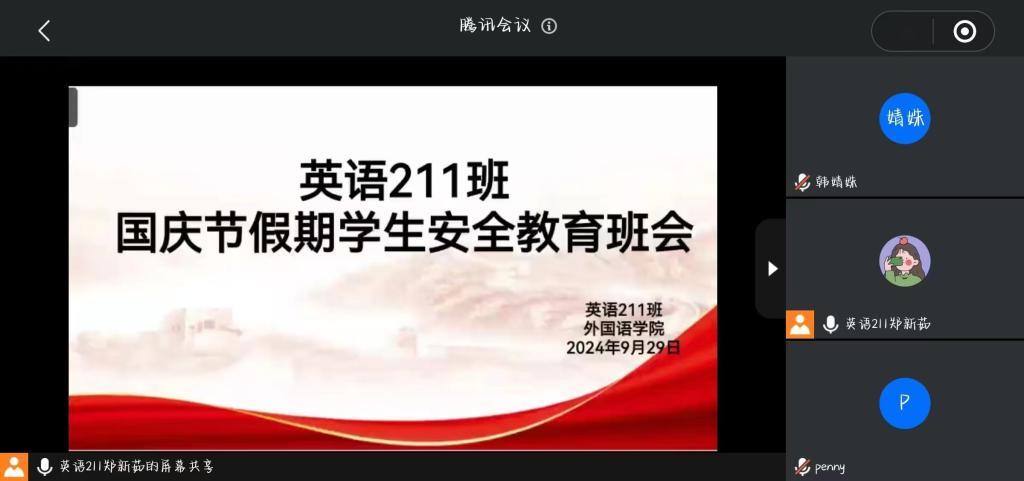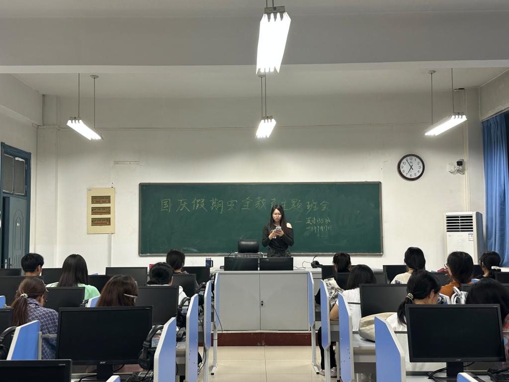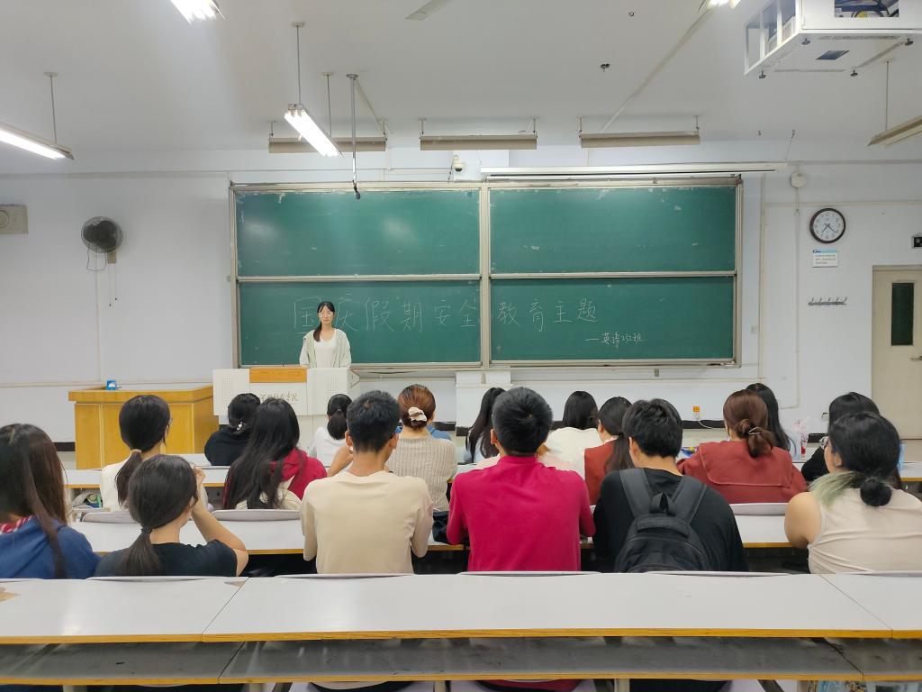 班会传达了学院关于做好国庆节假期学生安全教育工作的会议精神,结合具体案例引导班级同学注意人身安全、财产安全、交通安全、宿舍用水用电安全、饮食安全、心理安全、预防网络电信诈骗以及预防极端天气等,提醒同学们在节日期间增强安全防范意识和自我保护能力,科学地规划假期时间,合理安排个人学习生活,按时返校。