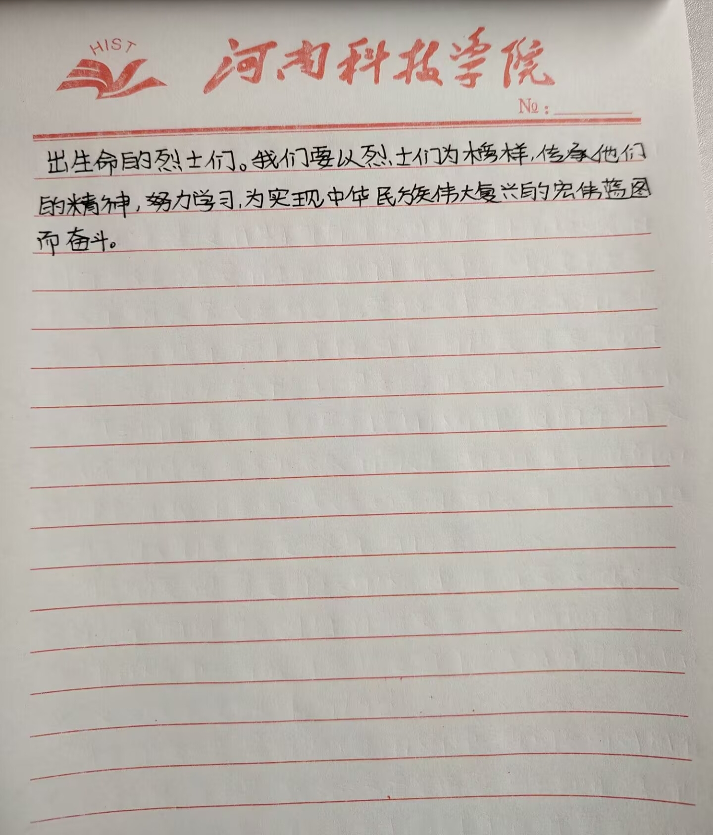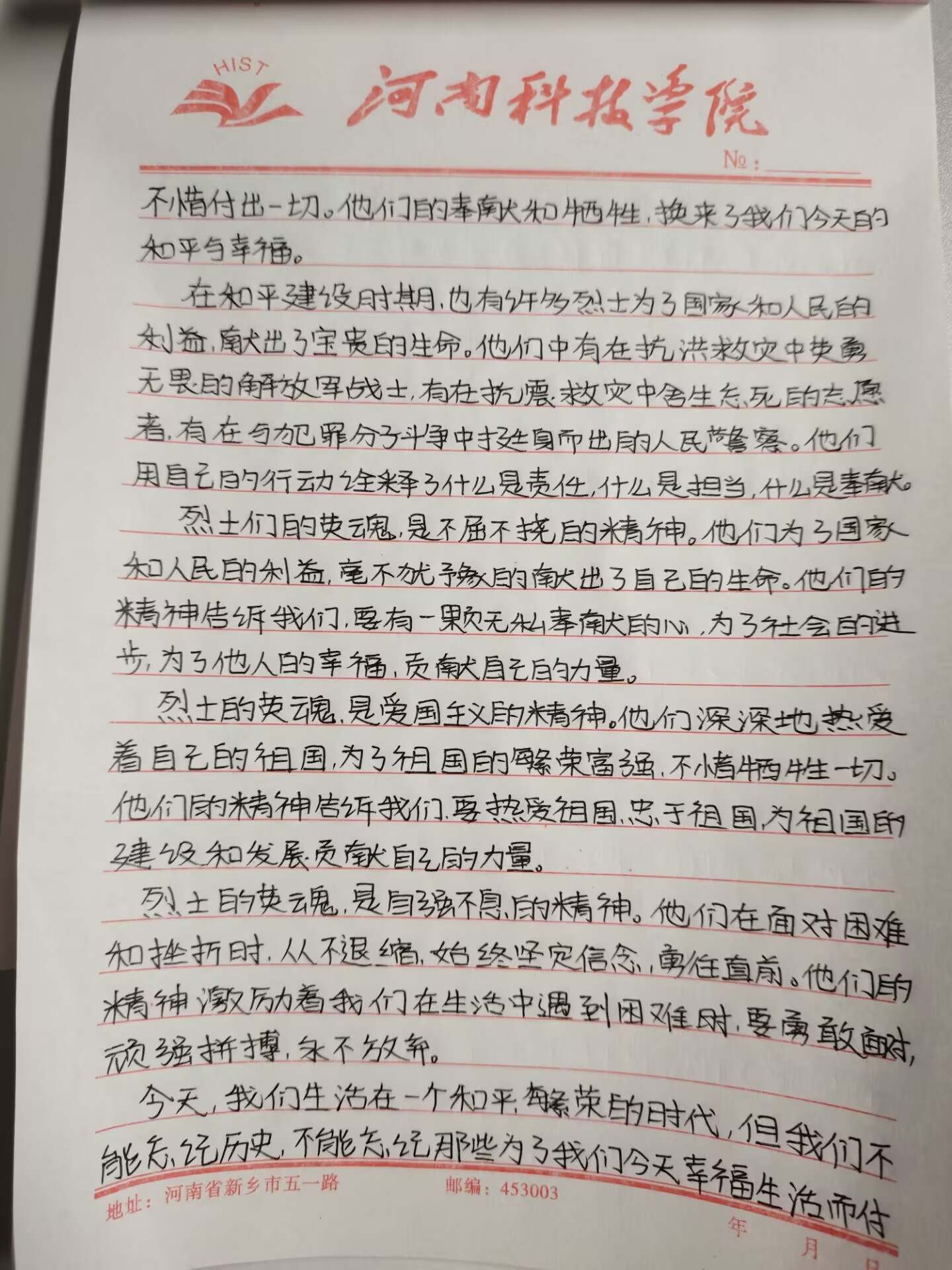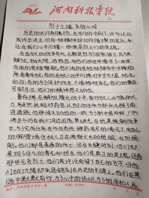 我院积极组织同学们参加“烈士之魂,永驻心间”征文活动。同学们在书写征文的过程中,深入了解和学习了革命先烈的英勇事迹,激发了大家的爱国情怀。一篇篇征文凝聚了学生们对革命先烈的崇敬之情,展现了当代青年对英雄先烈的赞美与怀念。