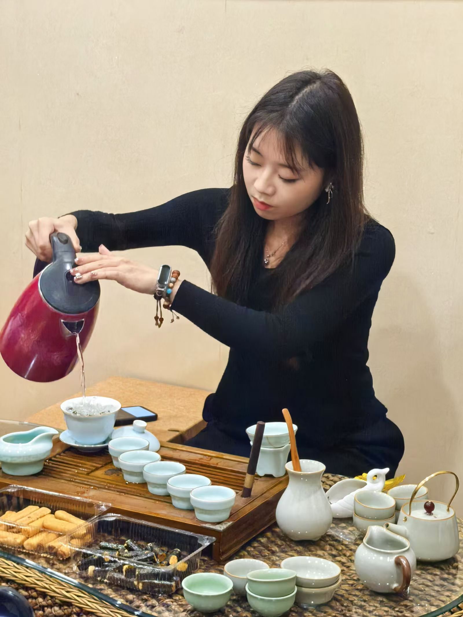 食品学院茶艺社高佳丽同学首先向大家详细介绍了茶文化的发展历程,讲解了各类茶具的名称、茶具的挑选、茶的冲泡技巧、茶桌礼仪等基本知识,同学们认真学习,沉浸其中,然后展示了精湛的茶艺表演,开场礼、展茶、温器、投茶、洗茶、正泡、巡杯、敬茶、品鉴,每一个环节都宛如一场高雅的艺术盛宴,每一个动作都行云流水,精准优雅,尽显从容和自信。同学们在活动中卸下了一周的疲惫,在品鉴中释放了压力。