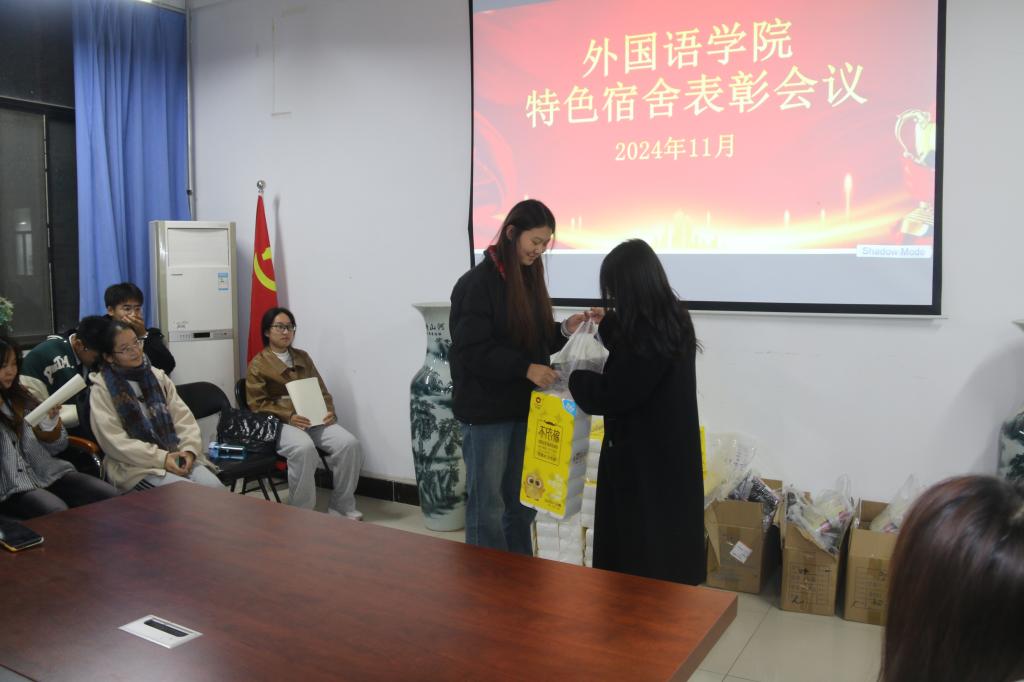 特色宿舍表彰名单,并为获奖宿舍颁发奖品。经过多轮严格评选,共有22个宿舍被评为学习型宿舍、才艺型宿舍、活力型宿舍、温馨型宿舍。与会老师为获奖宿舍颁发奖品,希望受到表彰的“特色宿舍”要充分发挥好先进典型的示范作用,带动全院宿舍共同营造安全温馨和谐的宿舍氛围。