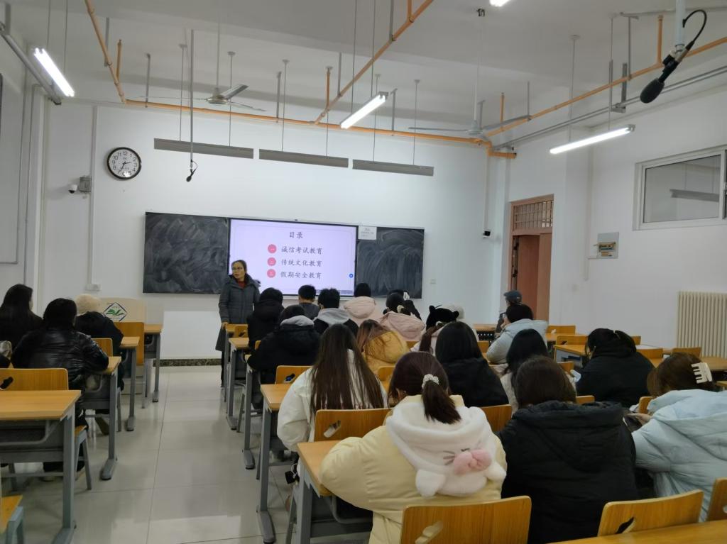 班会重点围绕诚信考试教育、传统文化教育、假期安全教育三个方面展开。各年级辅导员和各班班主任结合真实的案例向学生强调了诚信考试的重要性,组织学生认真学习了《国家教育考试违规处理办法》《学生考试作弊处理办法》《处分材料汇编》,教育引导学生结合专业特点提前做好期末考试复习规划,自觉抵制不良考风,杜绝一切舞弊形式;共同学习了中华民族以孝为先、谦和好礼、团结友爱等优秀传统美德,引导学生自觉反对铺张浪费、炫富攀比、封建迷信等不良习俗,遵守燃放烟花爆竹有关规定,倡导低碳、绿色、环保的生活方式;围绕大学生意识形态、网络、宿舍消防、交通、防电信诈骗等内容对学生进行安全主题教育,组织学生学习《学生宿舍管理办法》《关于禁止私自组织学生集体外出、旅游的通知》等文件,提醒学生离校前进行断水断电等宿舍安全检查等,提高了学生的各类安全防范意识和自我防护能力。