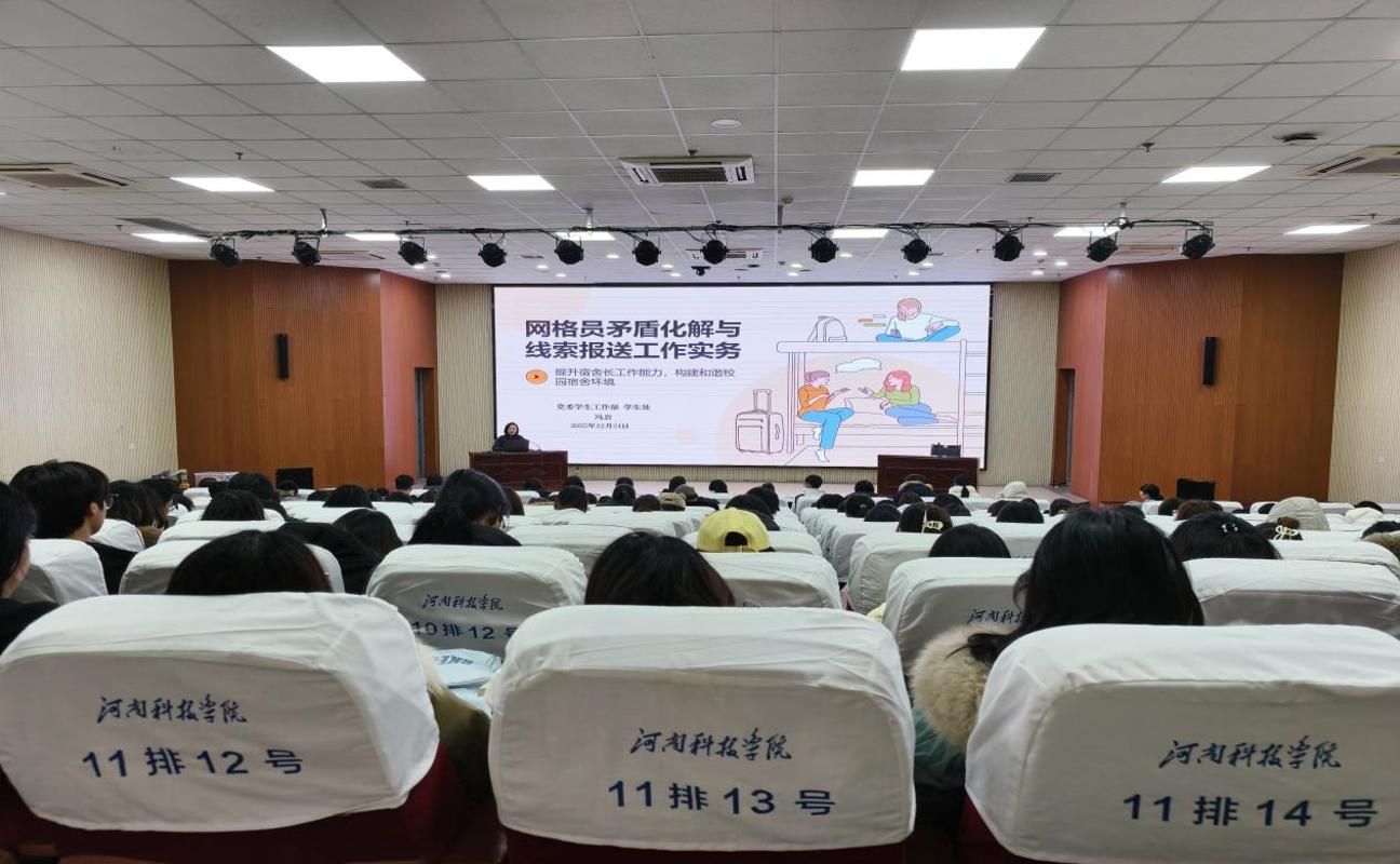培训会上,冯岩以“网格员矛盾化解与线索报送工作实务”为题,结合自身多年学生工作经验与典型案例,从宿舍长的“四个身份”切入,深刻阐释了宿舍长在宿舍网格化管理中的枢纽作用。她围绕宿舍长岗位职责、工作基本原则展开系统讲解,细致梳理宿舍常见矛盾类型,重点传授矛盾排解“三先三后”工作法与“四步调解”流程,同时对信息报送线索识别要点、宿舍常见问题应对技巧进行全面解读。此外,冯岩还结合学生成长发展实际,阐明宿舍长工作对个人能力锤炼与未来职业发展的重要意义,勉励全体参训人员要勇于担当、主动作为,以高度的责任心和服务意识,携手营造安全、整洁、和谐的宿舍育人环境。