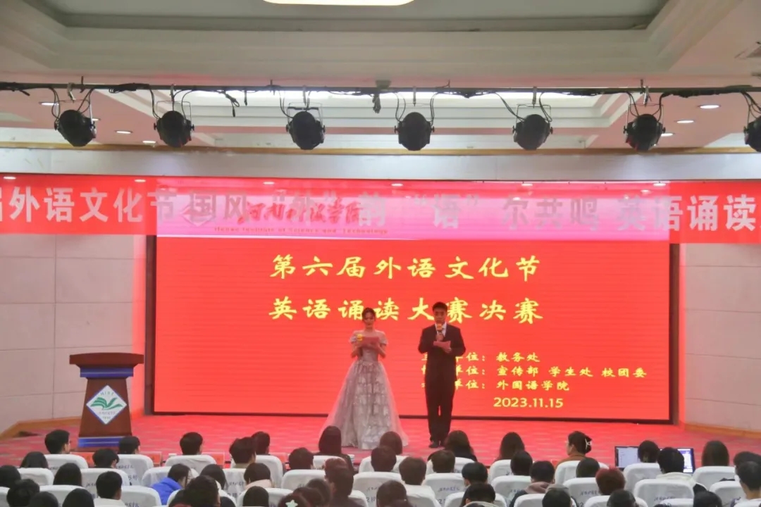 第六届外语文化节英语诵读大赛。校团委书记张永波、学院党委书记王彦杰、党委副书记吴峰和副院长张志超出席本次比赛。