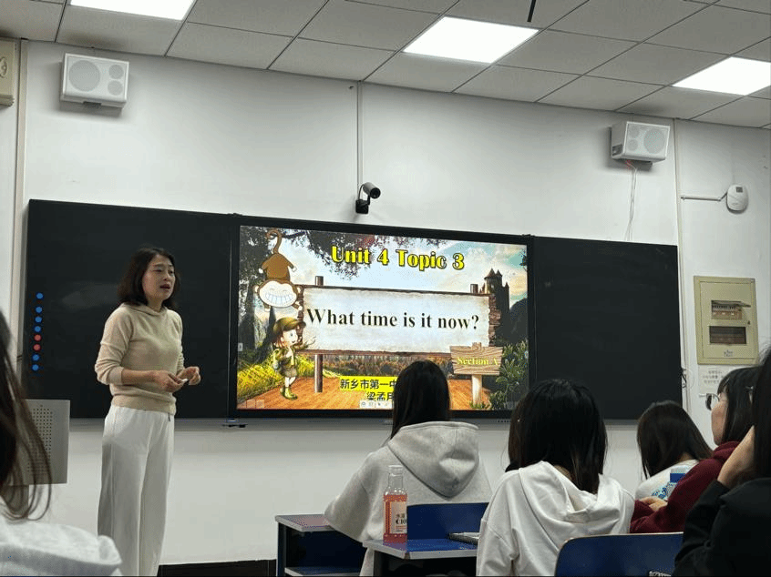 梁老师为同学们解读了中学英语的新课程标准,与同学们探讨了课程思政的内涵,讲述了情境教学的内容并向同学们进行了案例分析展示。在讲座的最后亲自为同学们作题为“what time is it now”的初中英语听说示范课讲授。梁老师的示范课观点新颖、逻辑清晰、内容深刻,使同学们对新课标背景下如何将课程思政融入课堂有了更加全面且深刻的了解,真正达到了听众真心喜爱、终身受益、毕生难忘的教学目的。