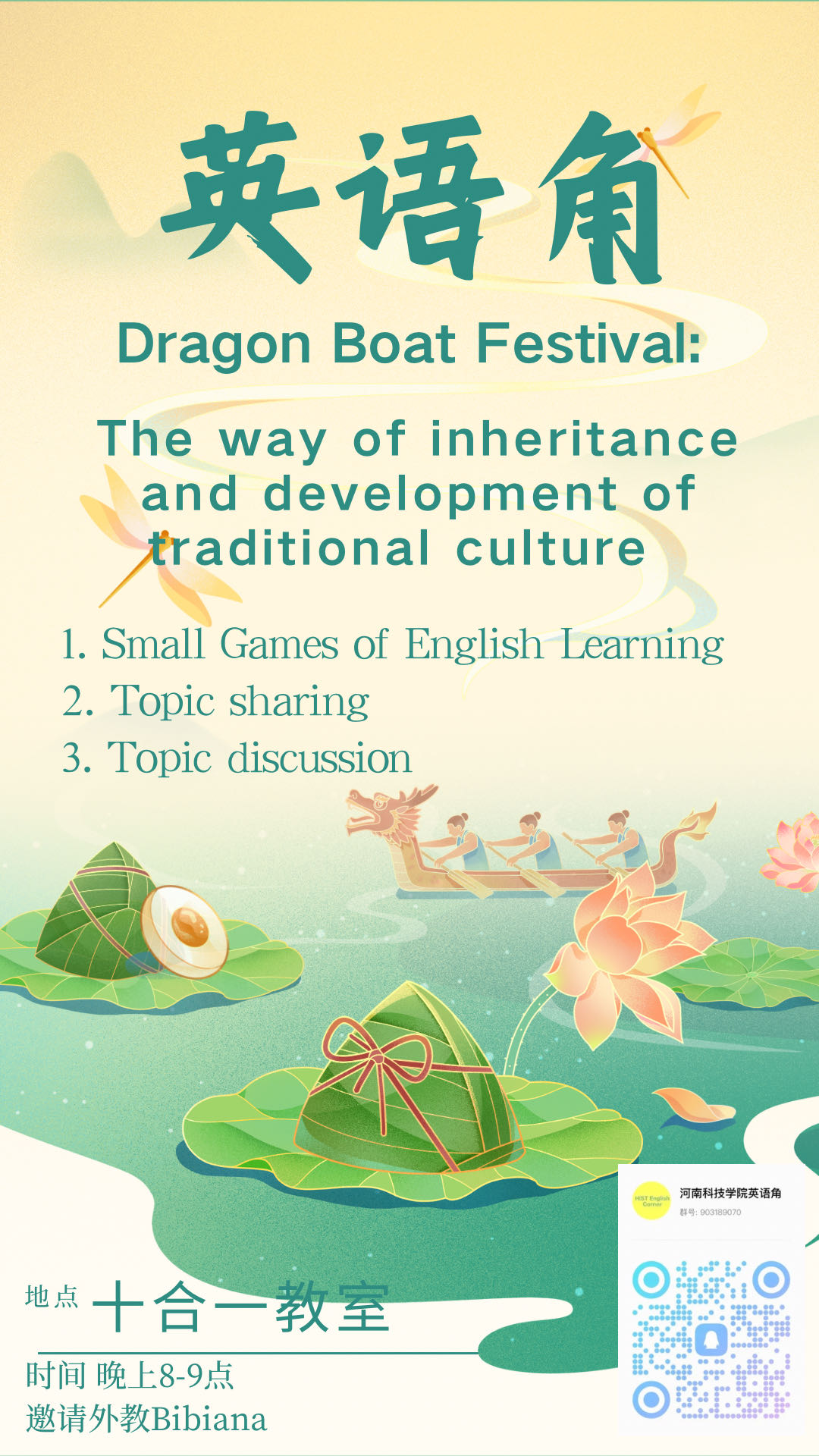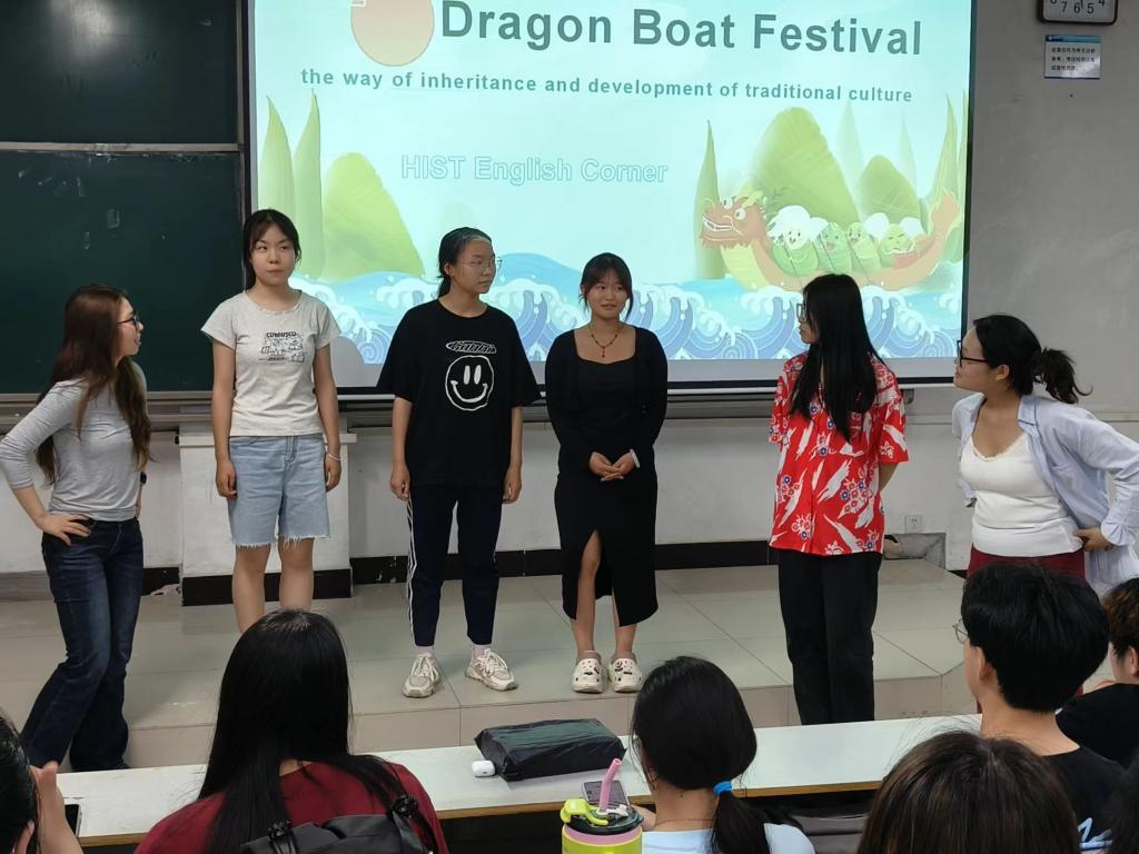 本次英语角以“Dragon Boat Festival”为主题,邀请外教Bibiana一起,展开了三个环节的活动。为增加活动的趣味性,在第一个环节中,同学们进行了英语学习的小游戏,现场气氛热烈。在第二部分的话题分享中,同学们纷纷分享了自己对端午节的理解、习俗等相关内容,这些传统的端午节元素在英语交流中焕发出新的活力。最后,在第三个环节的话题讨论中,同学们纷纷表达自己的想法和观点,锻炼了英语口语能力。