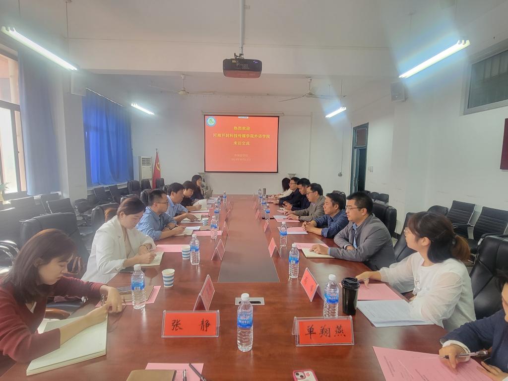 的历史沿革、办学定位、人才培养成效。李会民介绍了我院的机构设置、专业开设、师资力量、学科建设及科研平台的相关内容。张治江介绍了河南开封科技传媒学院外语学院的基本情况,分享了课程达标考核、重点学科建设、考研录取率以及英语教学改革的做法与经验。随后,双方就学院管理、大学英语教学、学科建设、专业建设、课程建设、师资培养、团学工作等进行了深入探讨。会后,代表团参观了学院语言实验室。