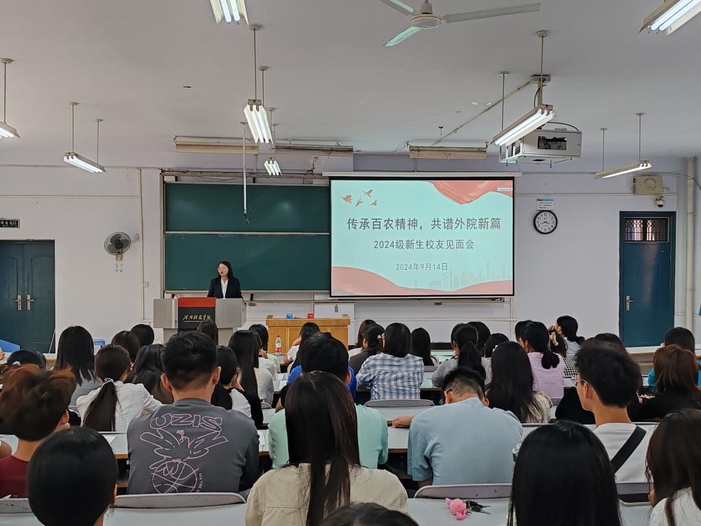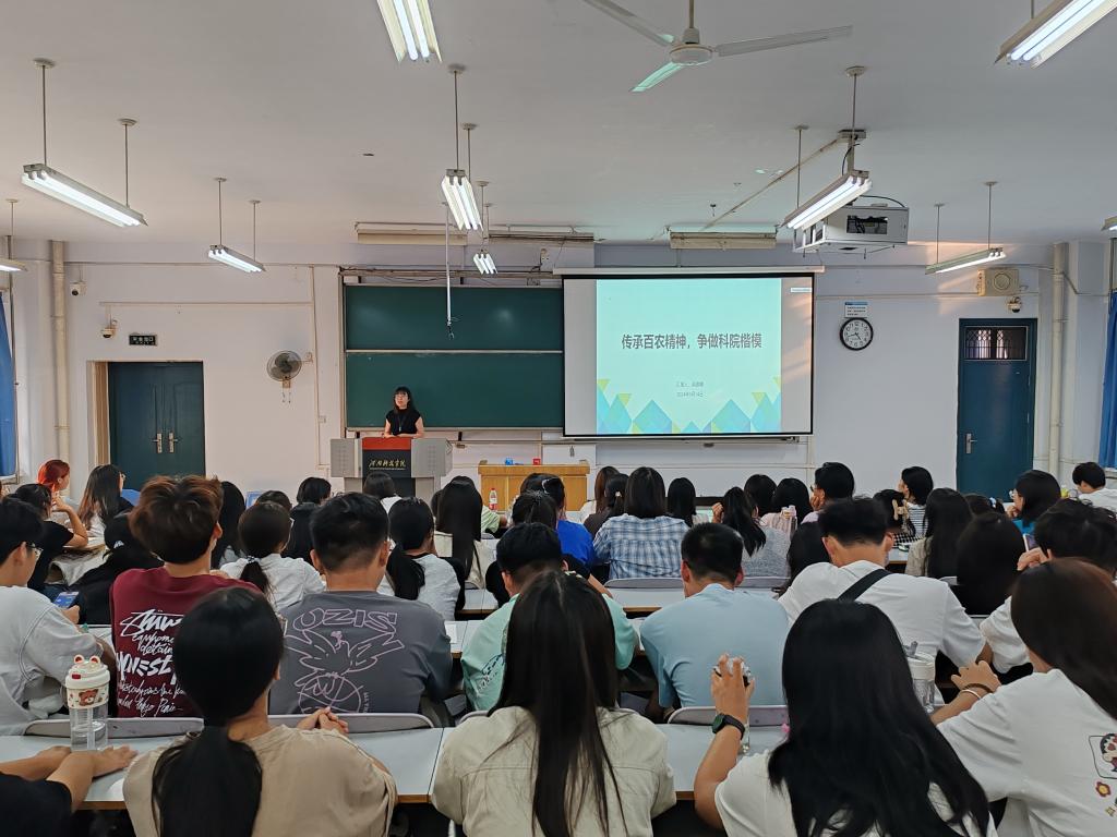在10#合二教室召开“传承百农精神,共谱外院新篇”专题报告会,会议由2024级新生辅导员朱晋妮主持,2024届全体新生参会。
