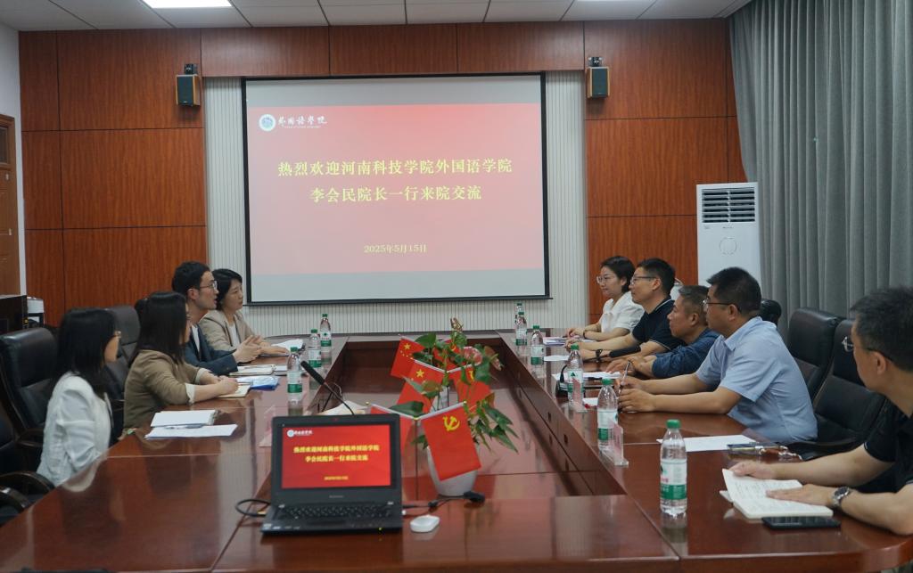 ,院长彭国珍介绍了其“三跨多融合”育人模式、慕课出海特色课程、公共外语特色育人体系等,李会民介绍了我院MTI翻译硕士招生与培养、大学英语教育等方面的情况。接着,双方探讨了英语专业教学改革、大学英语特色教学团队建设、课程优化方案等问题,并计划在师资培训、科研合作等领域开展合作。