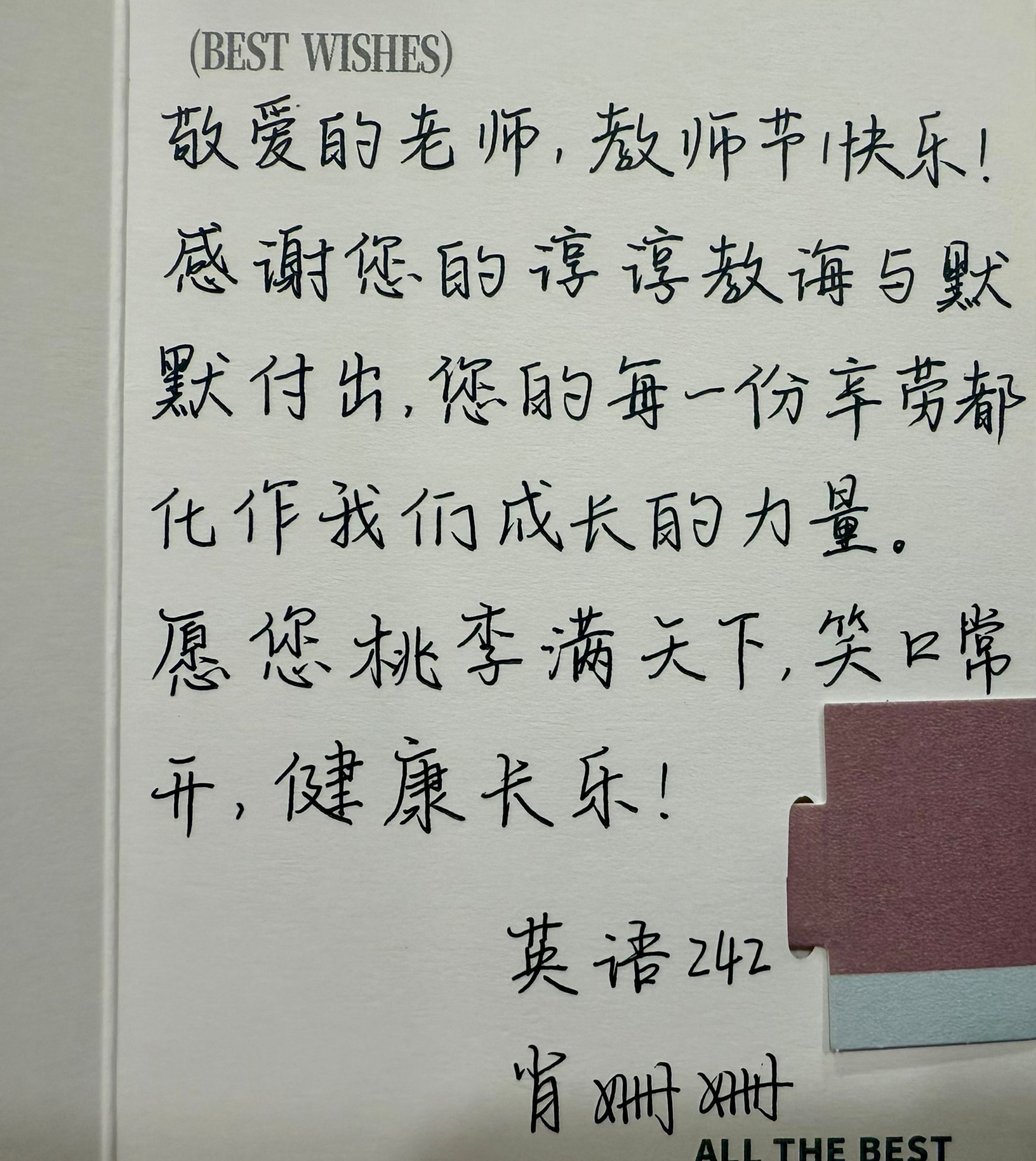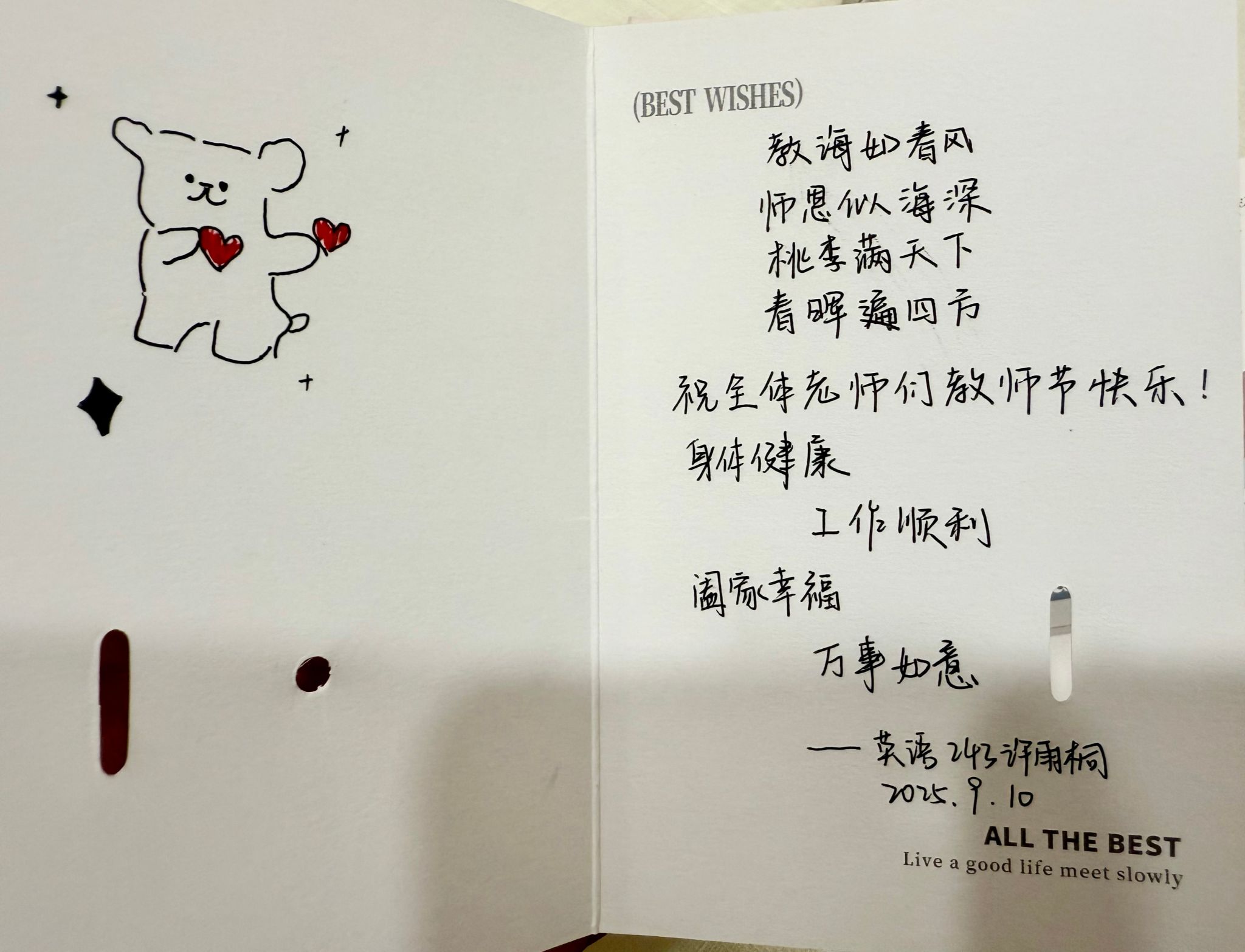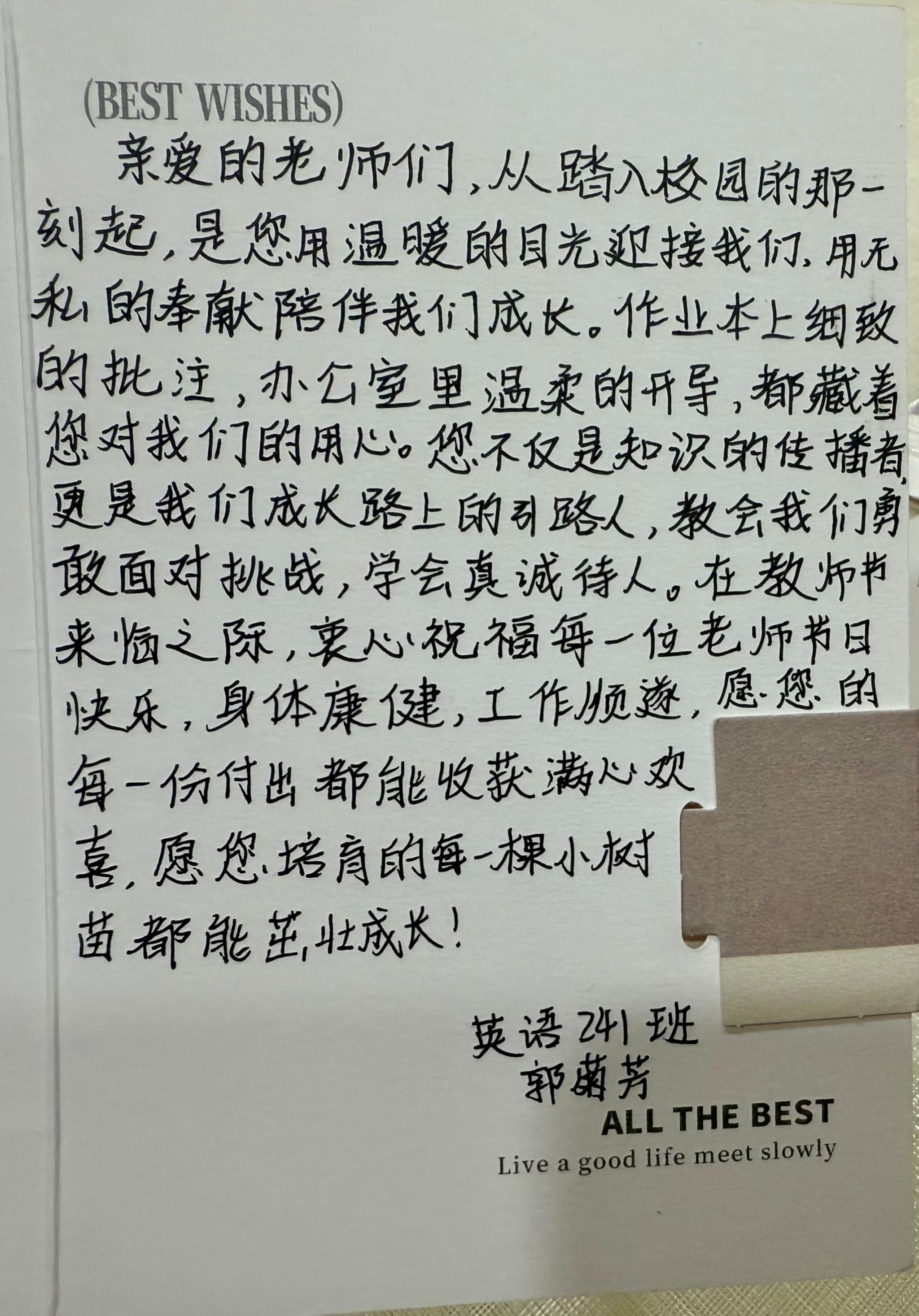 在这个特别的日子里,学生用一段段文字传递着对老师的敬爱与感激,每一张贺卡上的文字都传达着学生的真挚祝福,感谢老师们长期以来的谆谆教导和辛勤付出。