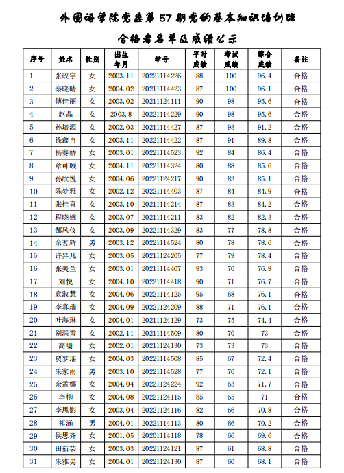 污污漫画 党委第57期党的基本知识培训班共26名,共34人参加本次党的基本知识培训班结业考试(其中8人为补考人员),最终32人成绩合格。现将成绩公布如下: